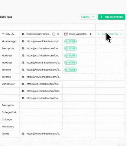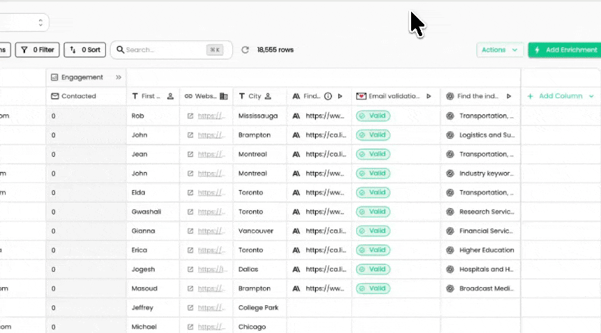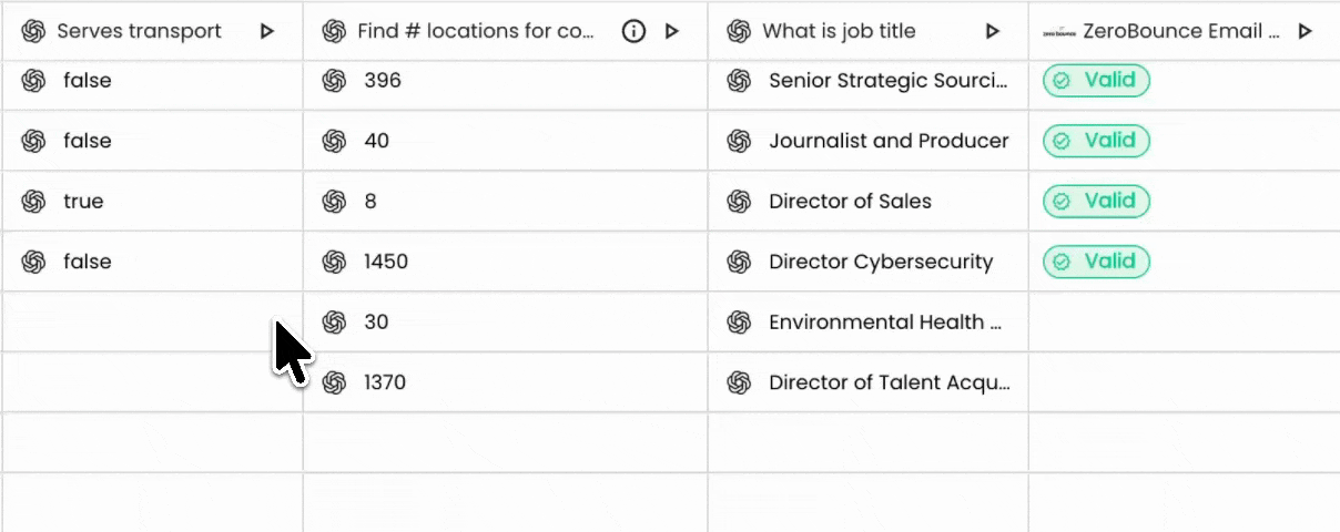 Use AI to instantly fill in missing details such as phone numbers, email addresses, email validation, keywords, location, custom prompts, and more.
